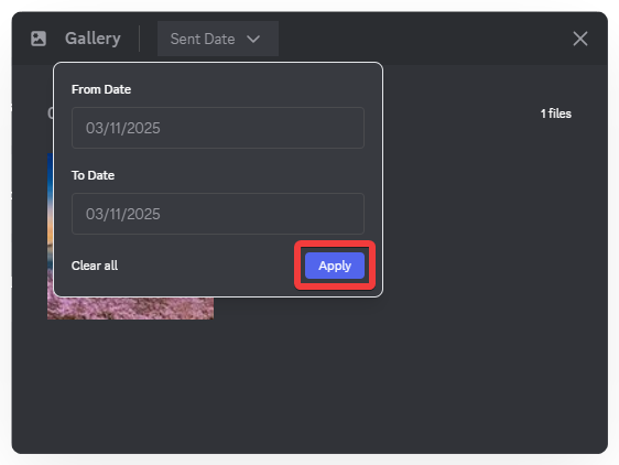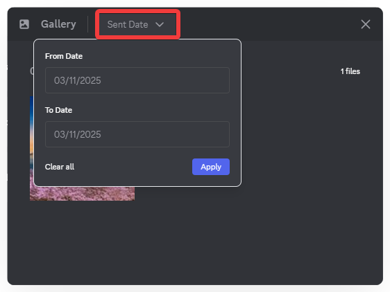 Gallery lets you view all images shared in a Text Channel or Thread and easily filter them by date to find the content you need.