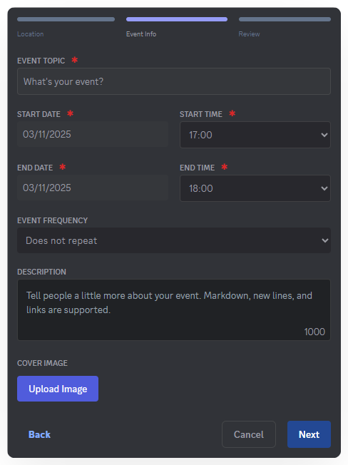- Other Locations: For real-life events or on other platforms, you can add a link or address so participants can easily follow and join.