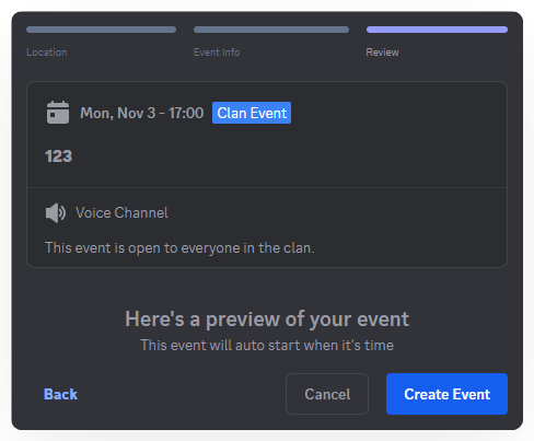 - No channel selected: The event becomes a Clan Event, visible and open to all Clan members.