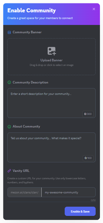 Example: Enter my-awesome-community to have: mezon.ai/clans/clan/my-awesome-community.