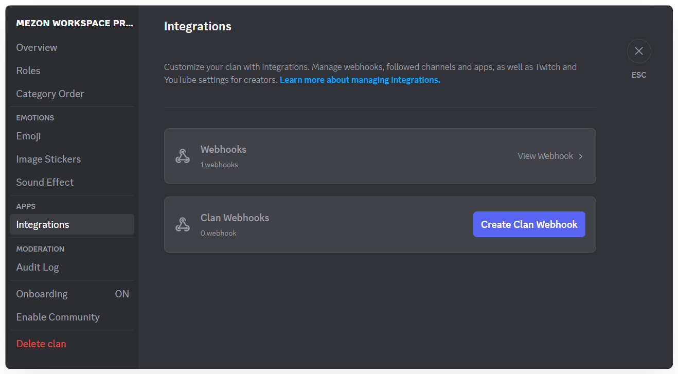 Mezon provides powerful tools to interact with your Clan through Webhooks. Learn how to set up and use webhooks in the Webhook Docs.