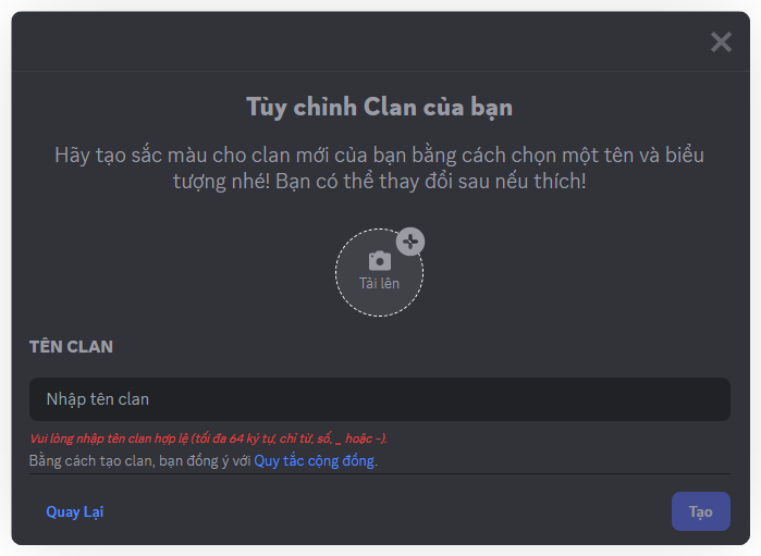 Đặt tên Clan (tối đa 64 ký tự, chỉ dùng chữ cái, số, _ hoặc -)