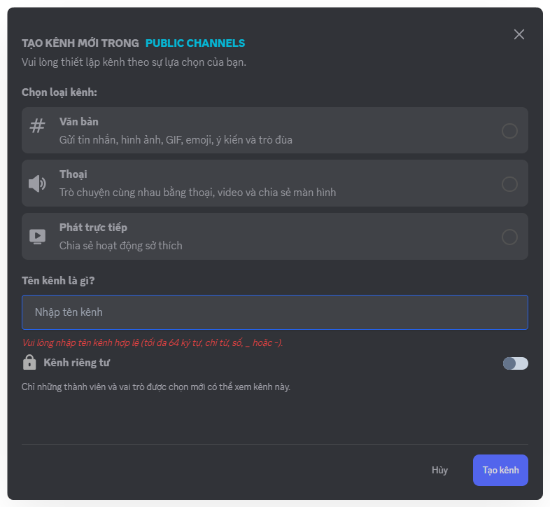 - Mô tả của kênh: mô tả cách thành viên nên sử dụng kênh này (Tối đa 1024 kí tự).