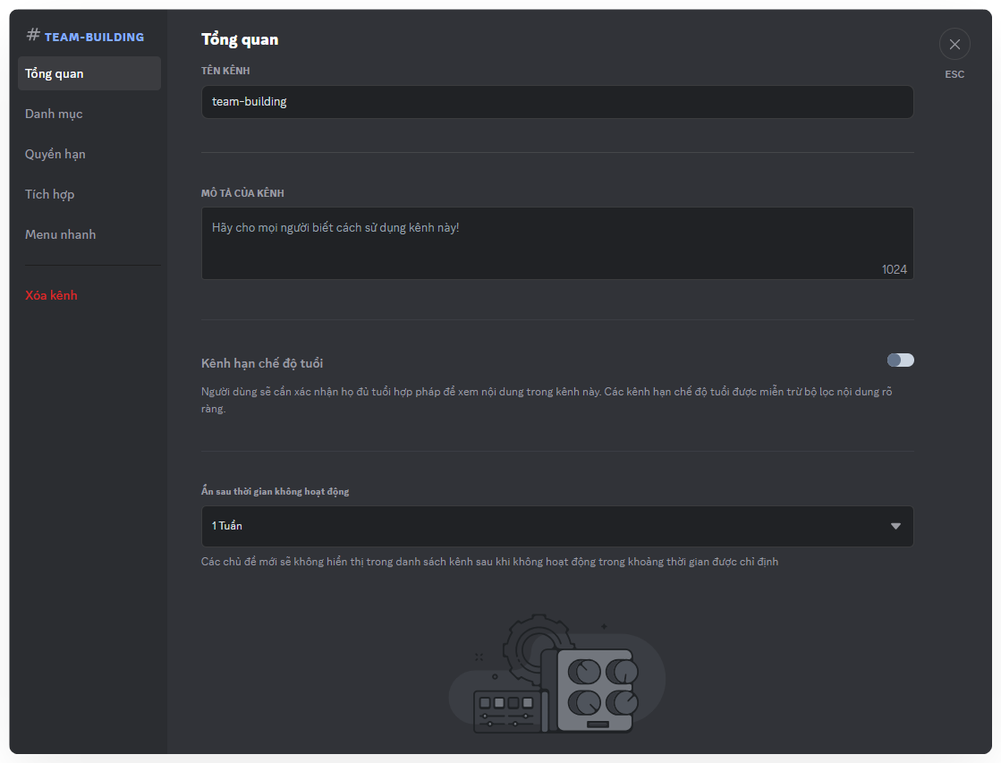- Kênh hạn chế độ tuổi: Bật/tắt tính năng cảnh báo giới nội dung nhạy cảm (NSFW). Các kênh bật chế độ hạn chế độ tuổi được miễn trừ bộ lọc nội dung rõ ràng.