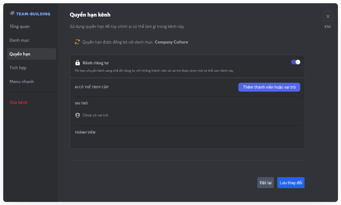 - Bật Kênh riêng tư để có thể tùy chỉnh về quyền hạn với chính xác Kênh đó.