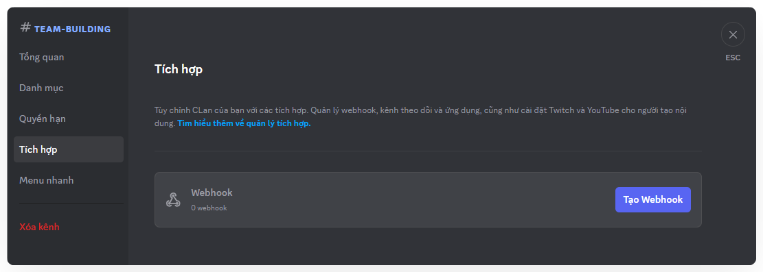 - Tạo và cài đặt Webhook riêng cho Kênh