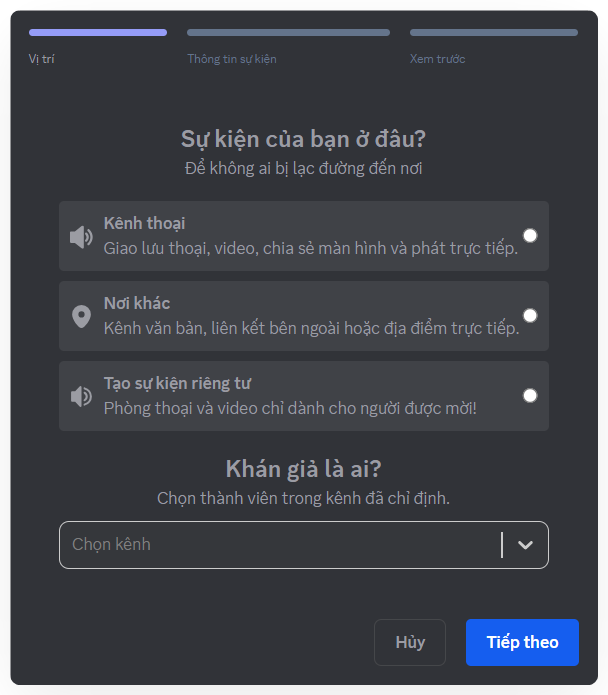 - Trong mục Khán giả là ai, nếu chọn một kênh, sự kiện sẽ trở thành Sự kiện Kênh, sẽ chỉ thành viên của kênh được chọn mới có thể thấy và tham gia.