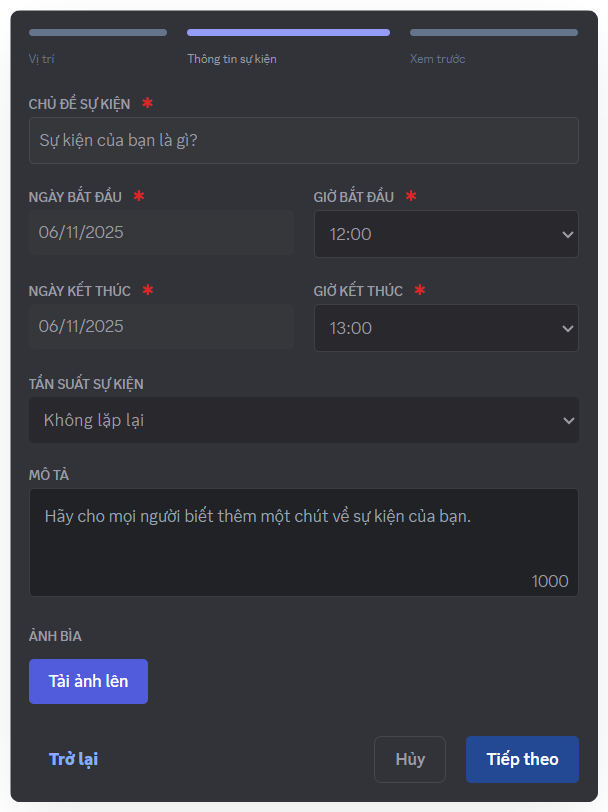 - Nơi khác – Nếu sự kiện diễn ra ngoài đời thực hoặc ở nền tảng khác, bạn có thể thêm link hoặc địa chỉ để mọi người dễ dàng theo dõi và tham gia.