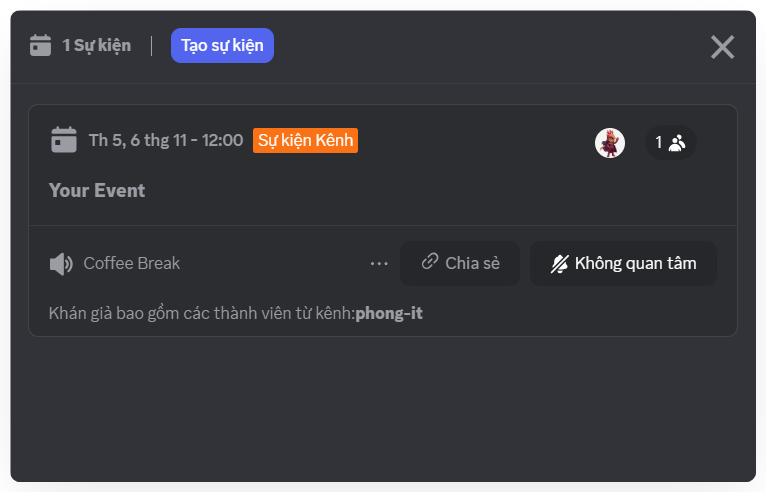 Sự kiện bạn tạo sẽ xuất hiện trong mục Sự kiện 📅 trên menu chính của Clan.