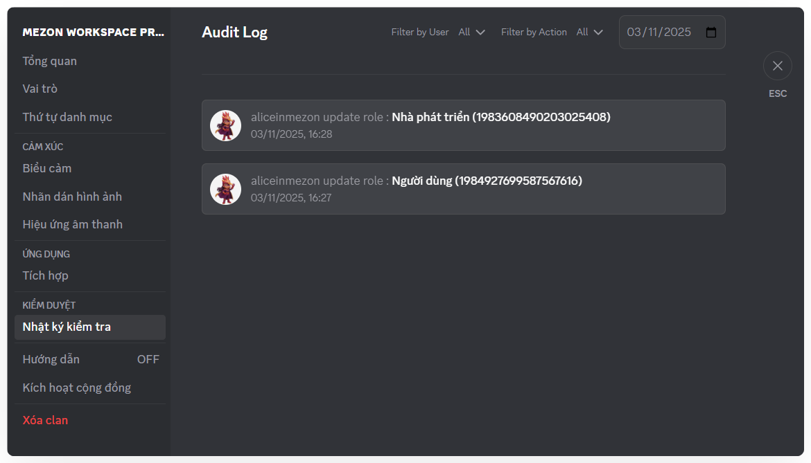 Là nơi lưu trữ những hoạt động quan trọng của Quản trị viên Clan. Khi Clan phát triển lớn mạnh và có nhiều hơn 1 Quản trị viên, Nhật ký kiểm tra là nơi theo dõi và tra cứu lịch sử hoạt động của Clan khi xảy ra sự cố/cần kiểm tra thông tin.