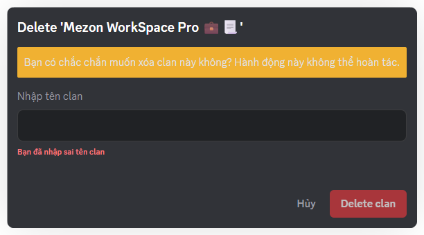 Lưu ý: hành động này không thể hoàn tác và toàn bộ dữ liệu, kênh và nội dung trong Clan sẽ bị xóa theo.