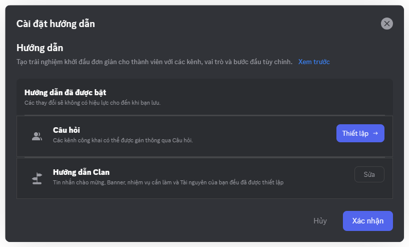 Sau khi kích hoạt, bạn sẽ có hai phần chính để cấu hình trải nghiệm Hướng dẫn người mới: Câu hỏi và Hướng dẫn Clan.