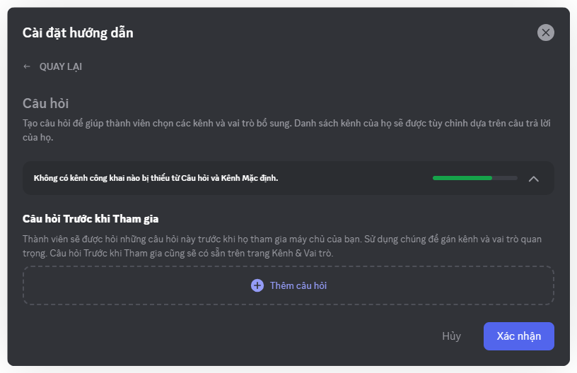 Tại đây bạn có thể đặt ra các câu hỏi và các câu trả lời (nếu có) để định hướng thành viên mới, giúp họ chọn lựa kênh phù hợp với sở thích hoặc vai trò của mình.