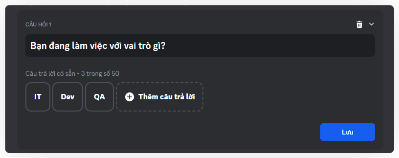 Nhấn vào "Thêm câu hỏi" để bắt đầu thiết lập từng câu hỏi cho người mới vào kênh. Những câu hỏi này có thể được xem như một hướng dẫn tương tác, giúp thành viên mới làm quen với cách hoạt động của Clan. Chính vì vậy, không có câu trả lời đúng hay sai, mà chỉ có những thông tin hữu ích.