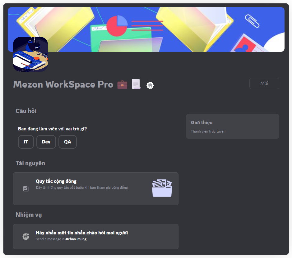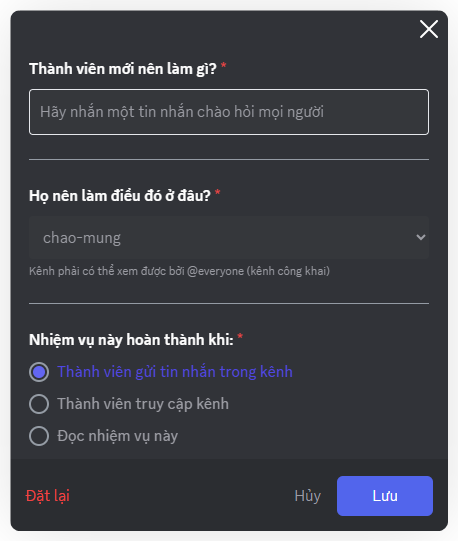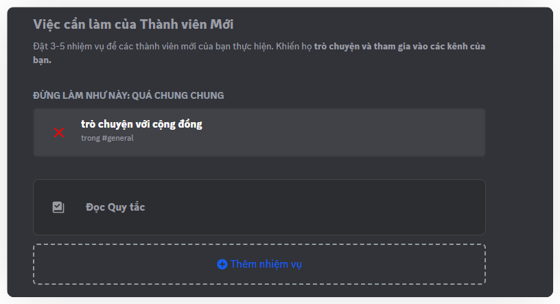 Thành viên mới nên làm gì?: Nhập mô tả nhiệm vụ (ví dụ: "Giới thiệu bản thân trong kênh #chao-hoi").